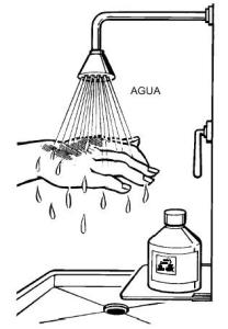 - Lavar con agua tibia o suero fisiológico abundante durante 10 min por lo menos.